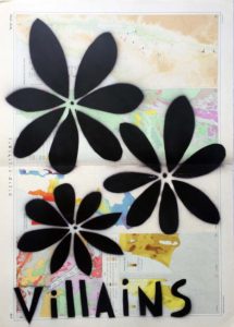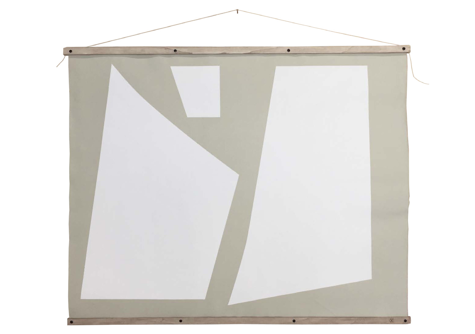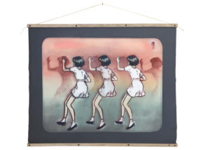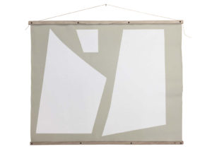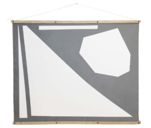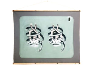 A new way of partnership collaboration, with one side of these painted banners having Mather’s simple, flat, geometric shapepile paintings, and the other side having one of Mando’s beautiful illustrative pieces.