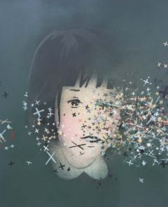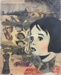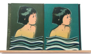 Mando Marie uses old book covers to pair the right imagery with a fitting title . The colours of these old hardcovers informed on which colours would be used in the whole show. Like nearly all of the work, these pieces have ocean side symbolism.